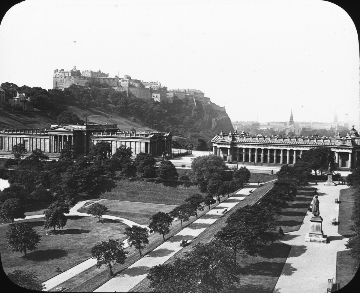 Skioptikonbild med motiv av National Gallery of Scotland, Edinburgh samt Edinburgh Castle på kullen i bakgrunden. National Gallery of Scotland är Skottlands nationalmuseum för konst.