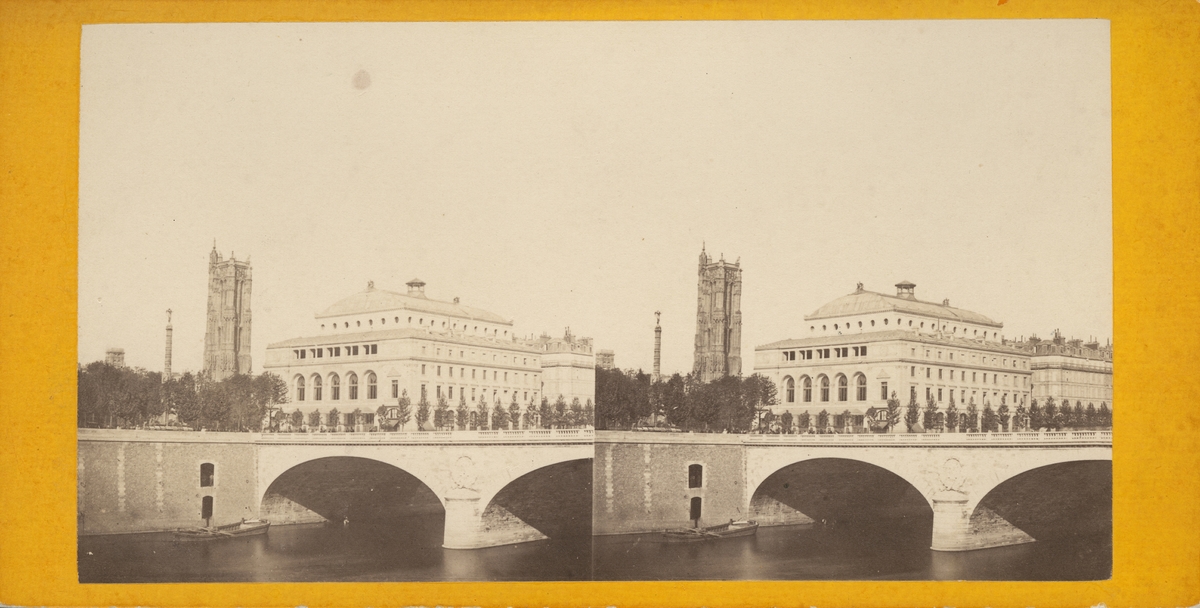 Stereobild med motiv av Saint-Jacques Tower till vänster och till höger, Théâtre de la Ville i Paris.