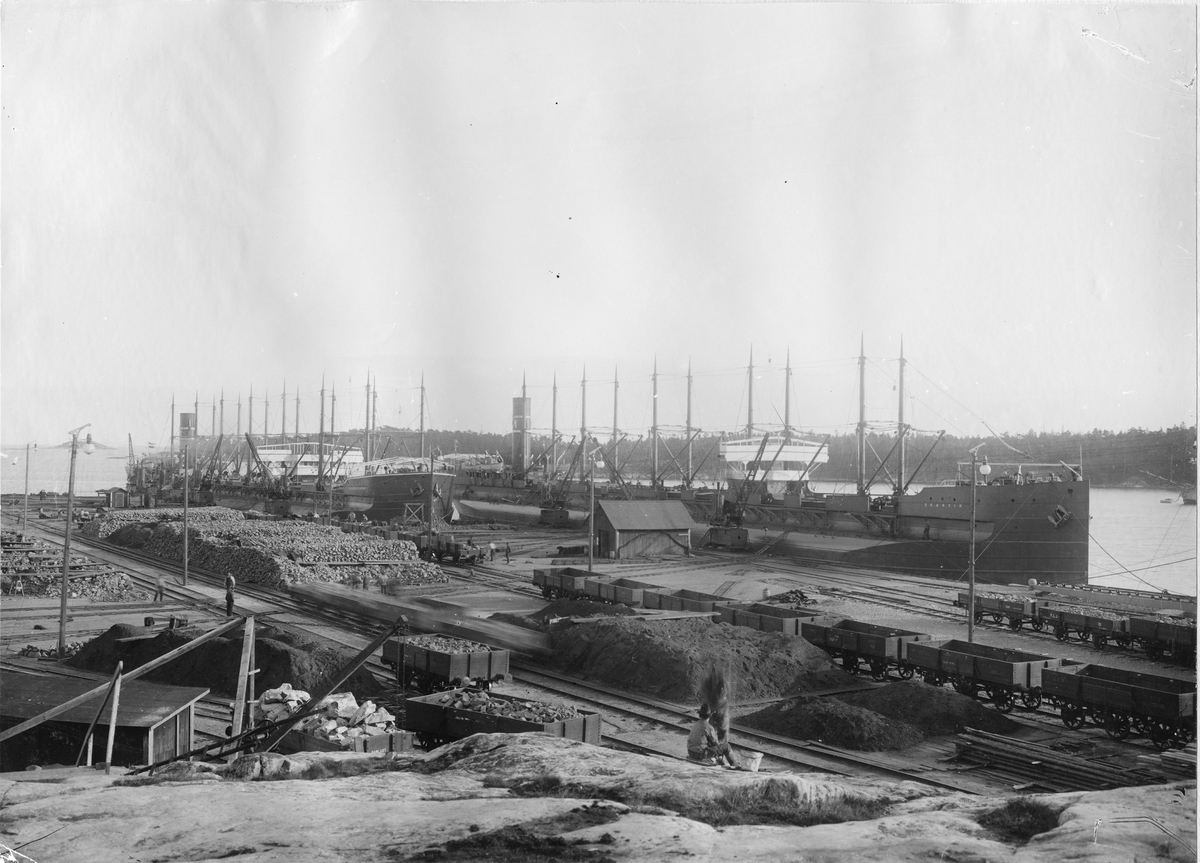 Bild över Oxelösunds hamn med malmångarna Gellivara och Skandia, 1908. Bild från tidskriften Hemmets bildmaterial.