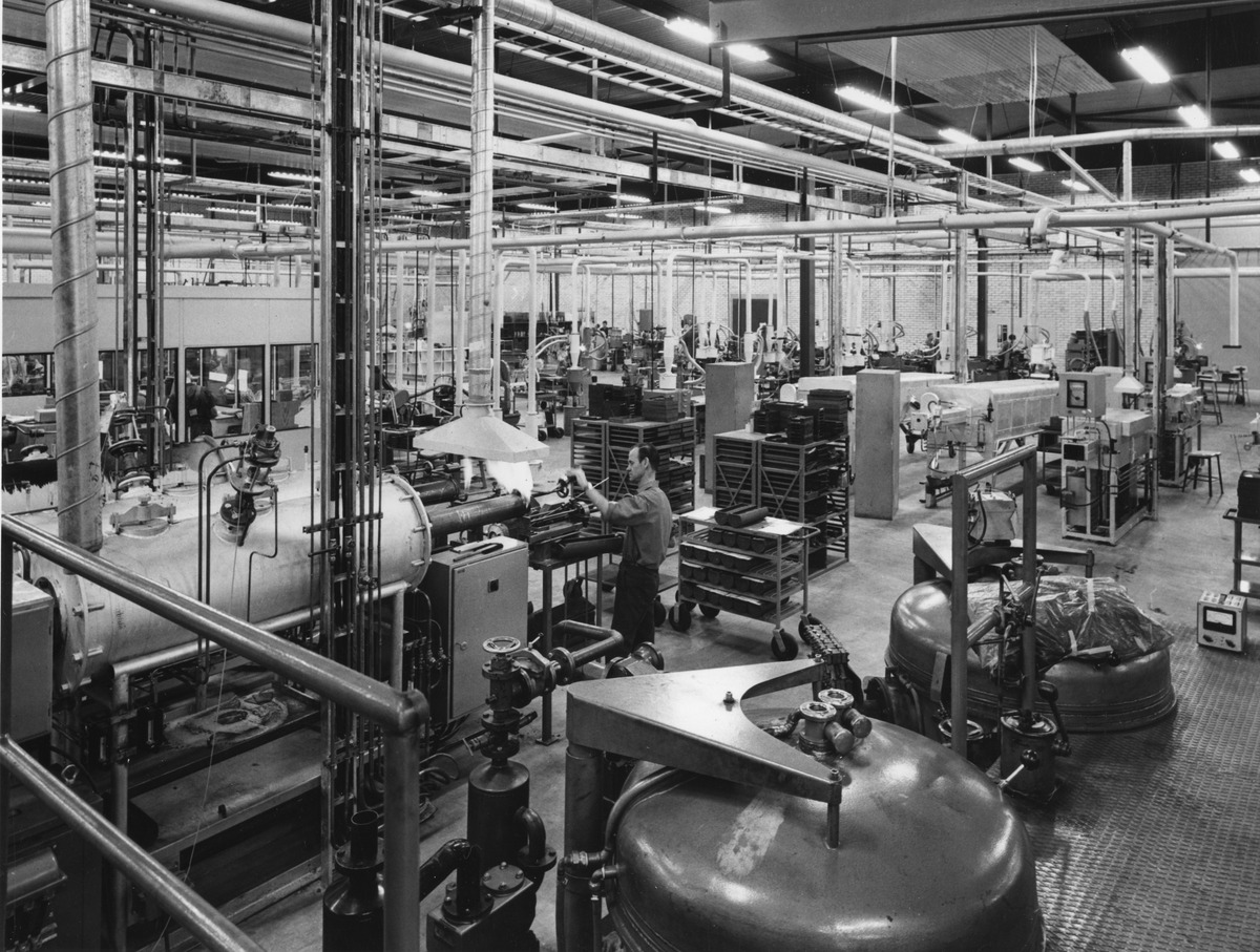 Fagersta Bruks AB. I de mindre ungnarna sker sintringen under vätgasskydd. Klockorna i förgrunden är ugnar där sintringen försiggår under vakuum.
