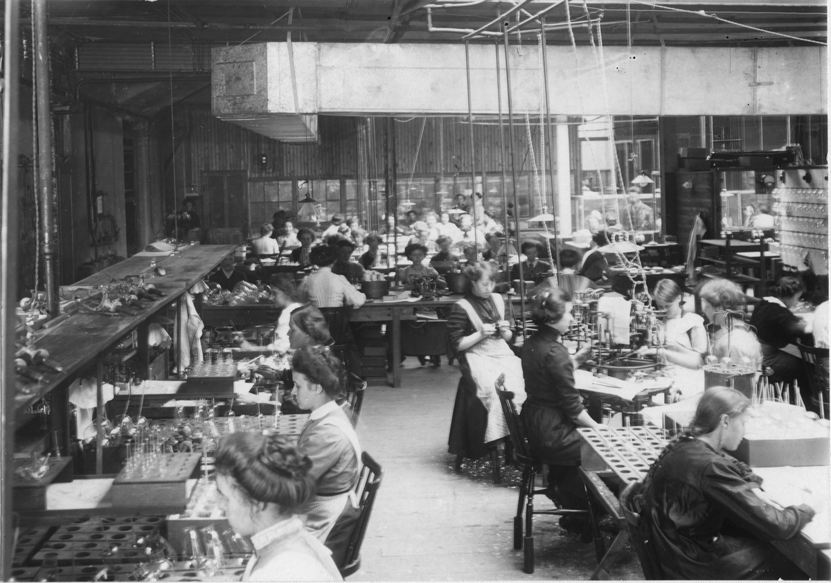 Metalltrådsfabriken vid Glödlampsfabriken på Blekingegatan 63 i Stockholm, före 1916.