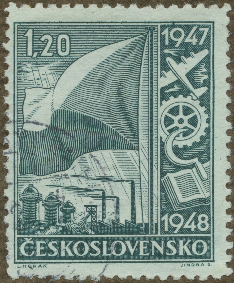 Frimärke ur Gösta Bodmans filatelistiska motivsamling, påbörjad 1950. Frimärke från Tschekoslovakiet, 1946. Motiv av "Diverse industrisymboler Monoplan, Kugghjul, Skära, Bok - symboler för återuppbyggnad - 2-årsplanen."