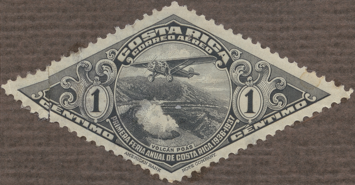 Frimärke från Costa Rica, 1937. Motiv av Enmotorigt monoplan över vulkanen "Poas" i Costa Rica "-Minne av första Costa Rica Mässan 1936-1937"