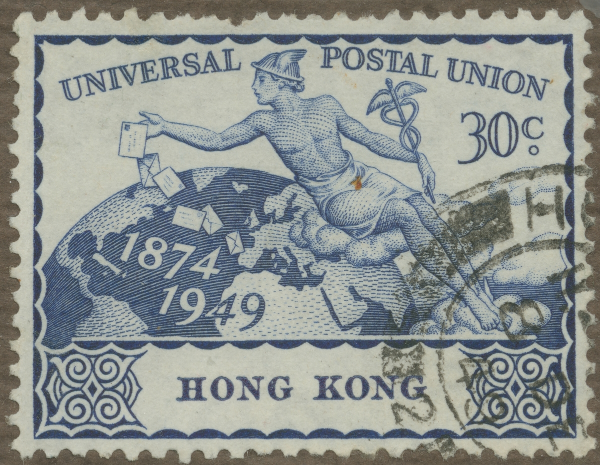 Frimärke från Hong Kong, 1949. Motiv av jordhalvklot och Atleten. Merkurius som brevförare. "U. P. U. 75 år 1874-1949".