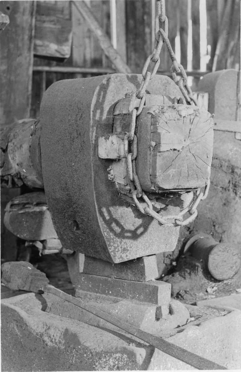 Skogafors bruk. Hammaren vid bruket, med två av de lyftande "kuggarna" synliga. Nederst till höger lager för stocken från vattenhjulet. Framför ligger bearbetat men ej färdigsmitt järnstycke.