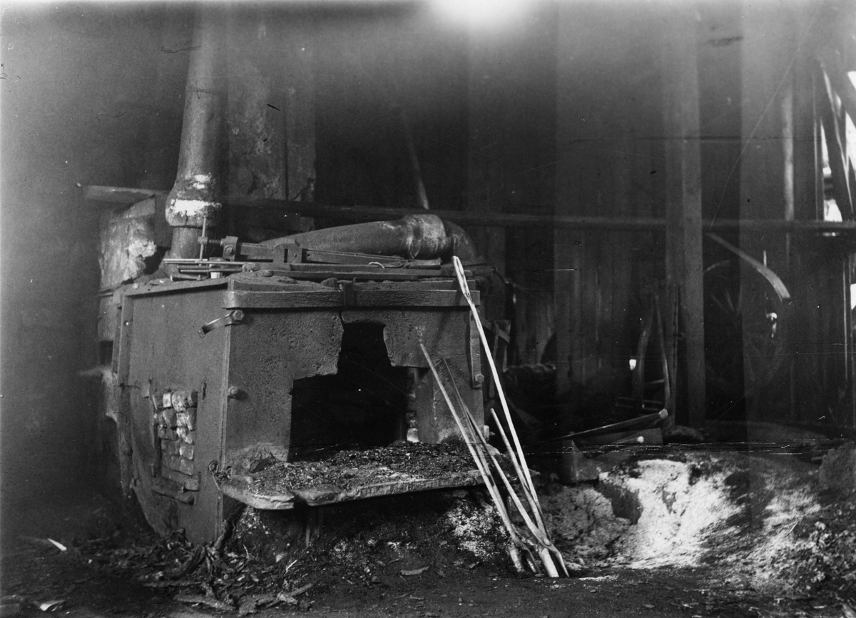 Skogafors bruk. Interiör från smedjan. Valljärnshärd för varm bläster och en "forma Franche-compté. Höjd och bredd 1,20 meter. Hela längden med bakre partiet 2 meter. Användes för hopsmältning av skrot eller för uppvärmning av större smidesstycken.
