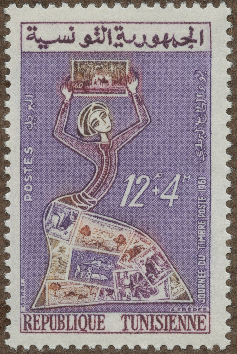 Frimärke från Tunisien, 1961. Motiv av Danserska från Kerkennah och frimärken -Frimärkets Dag: 1961-