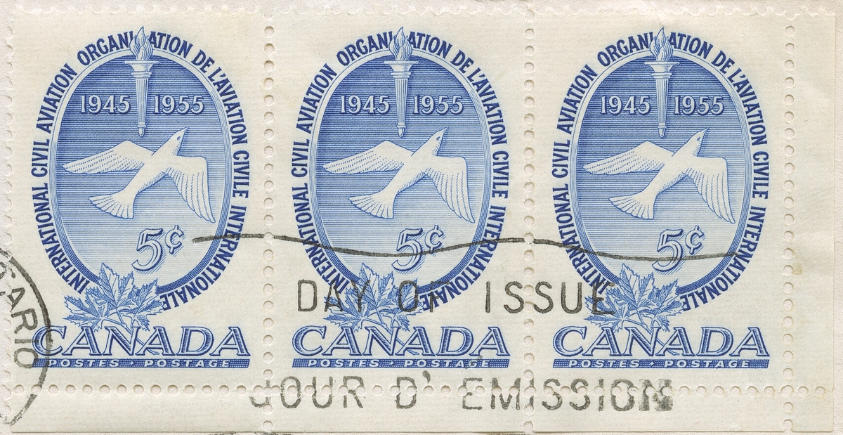 Frimärken från Kanada, 1955. Motiv av fackla och "Spirit of flight" symbol för flygning, med ICAO/ OACI. 10-årsminne av grundandet av den internationella civila luftfartsorganisationen. ICAO/ OACI. ICAO; akronym för International Civil Aviation Organisation (engelska). OACI; akronym för Organisation de l´aviation civile internationale (franska) och Organización de Aviación Civil Internacional (franska). "Förstadagsbrev" från Kanada 1955.