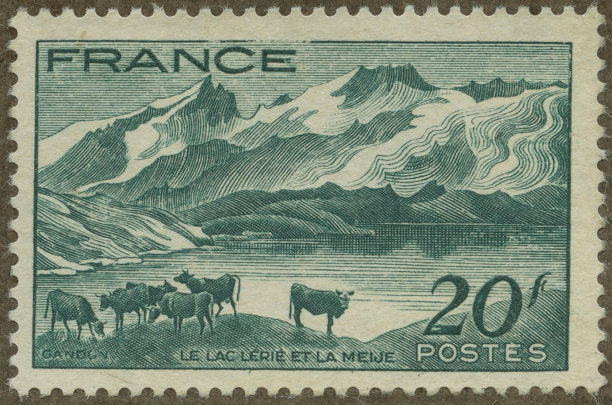 Frimärke ur Gösta Bodmans filatelistiska motivsamling, påbörjad 1950. Frimärke från Frankrike, 1943. Motiv av Franska Alperna i Dauphine´
