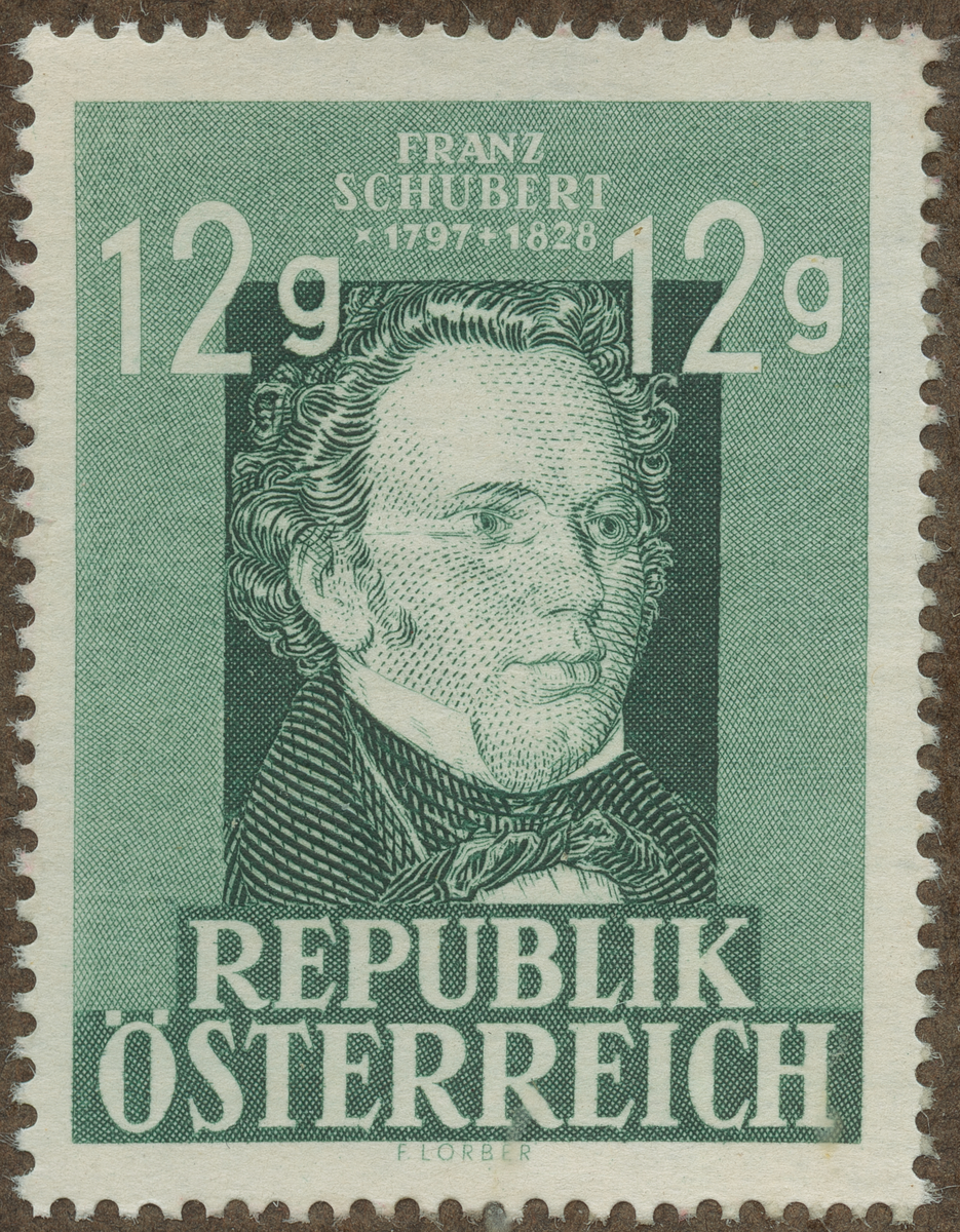 Frimärke från Österrike, 1947. Motiv av Franz Schubert 1797-1828 Österrikisk kompositör. 150-årsminne av hans födelse. 1797-1947.