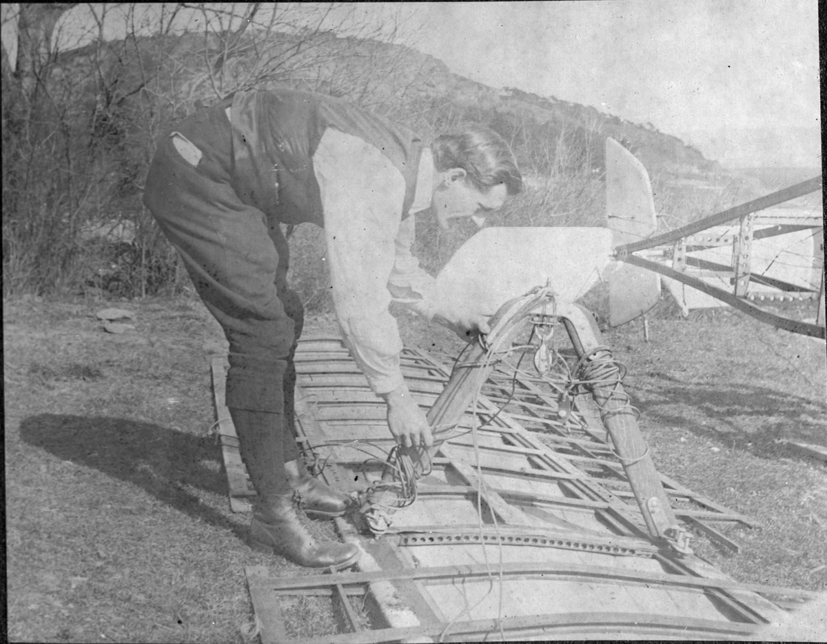 Fotografi ur album från Meisters-Flygaktiebolag i Göteborg. Karl Gustaf Meister arbetar med flygplansvinge.