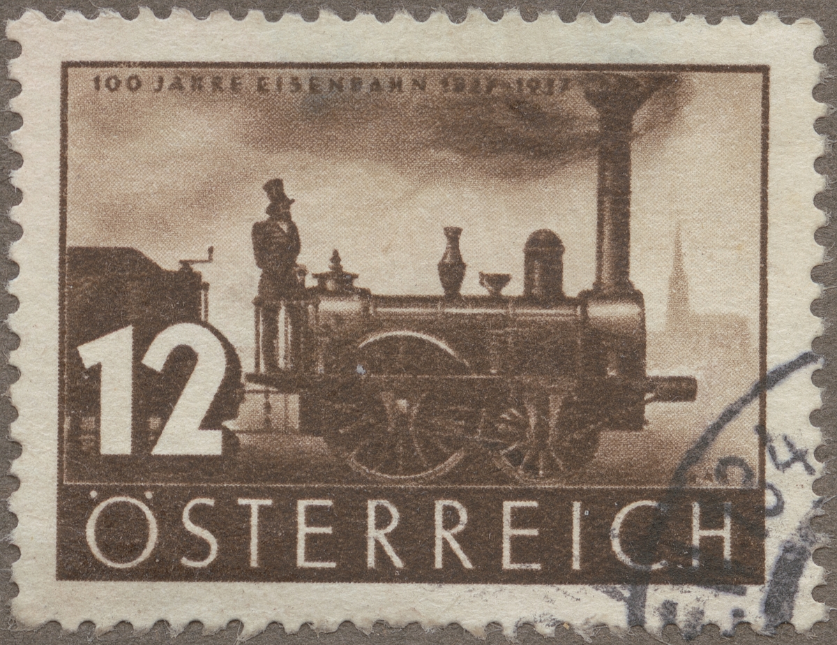 Frimärken ur Gösta Bodmans filatelistiska motivsamling, påbörjad 1950. Frimärke från Österrrike, 1937. Motiv av "Austria": Det första österrrikiska ångloket av år 1837 "Österrikes järnvägars 100-årsjubileum: 1837-1937"