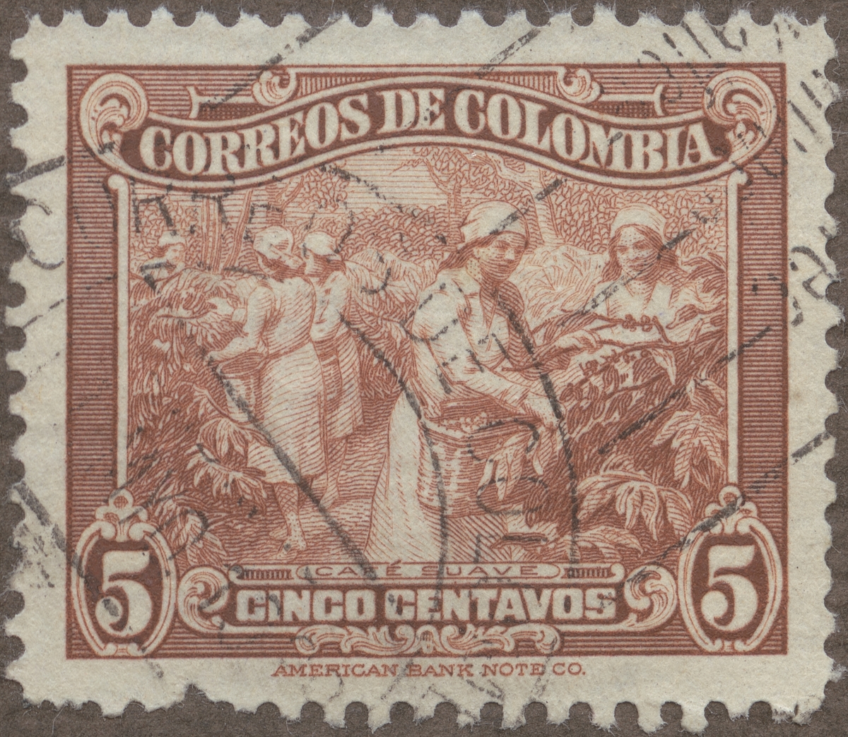 Frimärke från Colombia, 1939. Motiv av kaffeskördande.