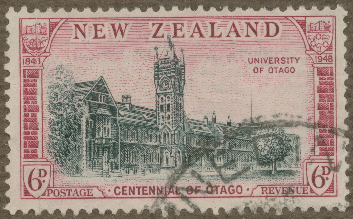 Frimärke från New Zealand, 1947. Motiv av Universitetet i Otago. "100-årsminne av provinsen Otagos grundande 1848".