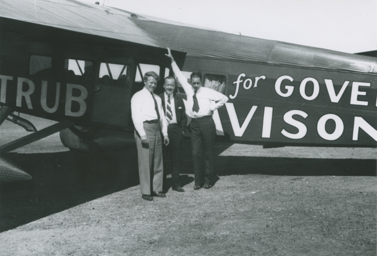 Fotografi från låda märkt Bernt Balchen. Balchen var norsk-amerikansk flygare, polarforskare och militär. Motiv av Balchen och två män som står vid flygplan.