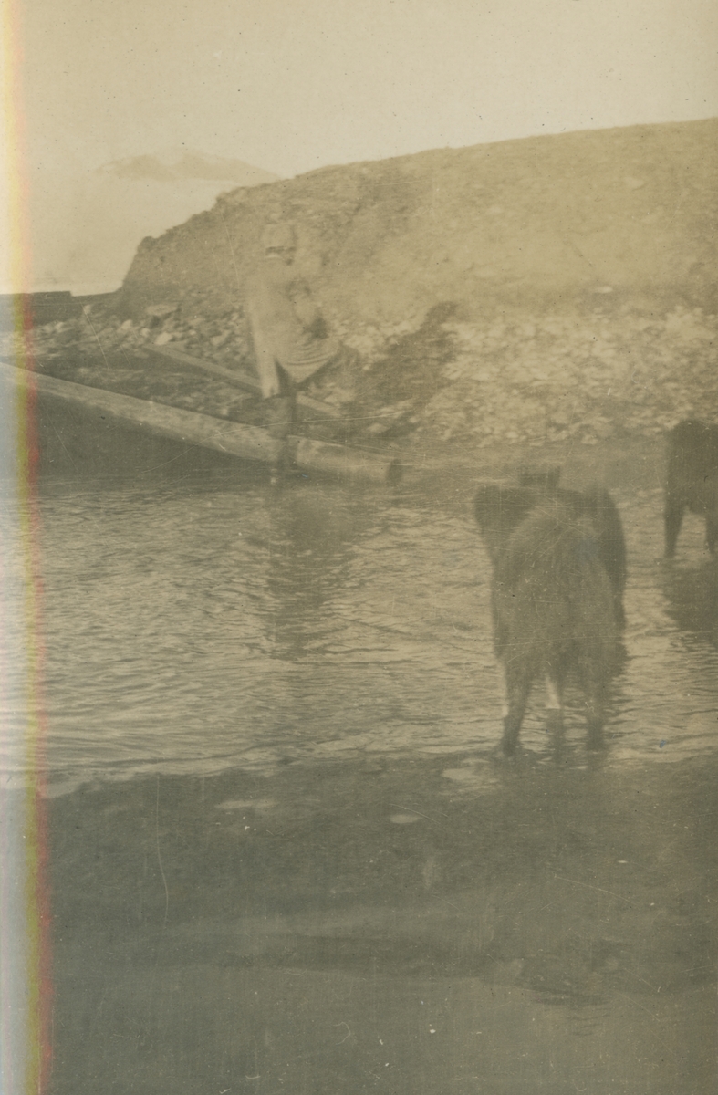 Fotografi från expedition till Spetsbergen. Motiv av man med hundar vid ett vattendrag i bergen.