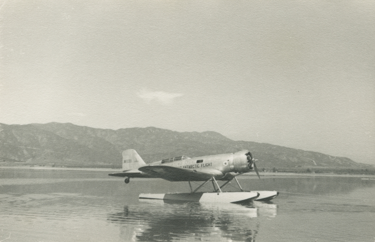 Fotografi från låda märkt Bernt Balchen. Balchen var norsk-amerikansk flygare, polarforskare och militär. Motiv av flygbåt i havet nära berg.