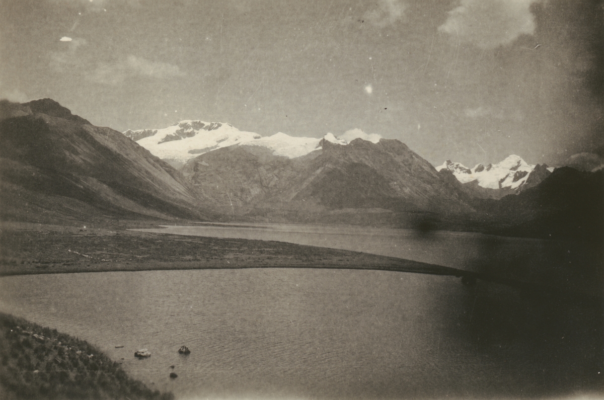 Fotografi från kuvert märkt med "Ernst Nordenskjöld". Vy över vatten och snötäckta berg.