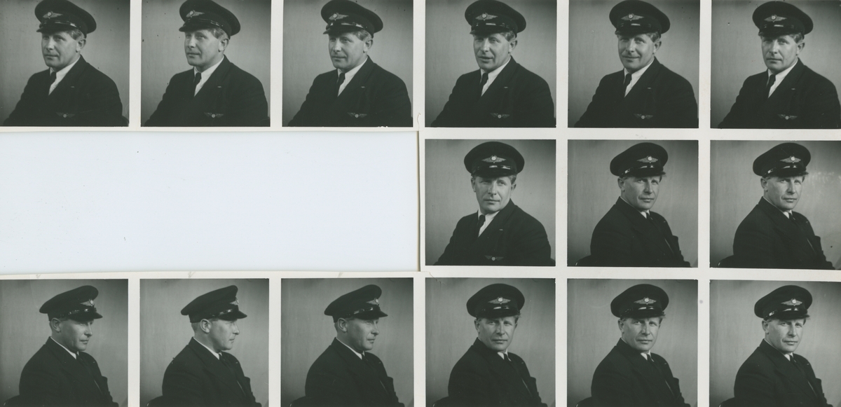 Fotografi från låda märkt Bernt Balchen. Balchen var norsk-amerikansk flygare, polarforskare och militär. en serie porträttbilder av Bernt Balchen.