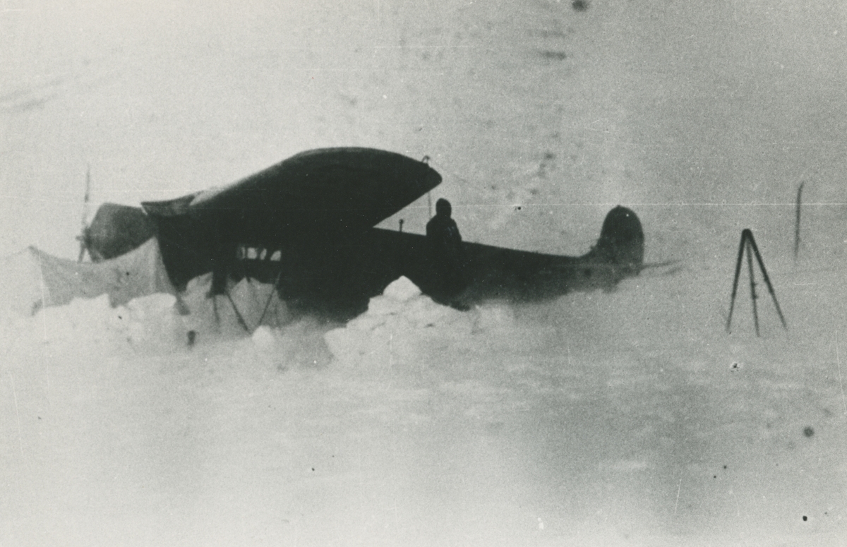 Fotografi från låda märkt Bernt Balchen. Balchen var norsk-amerikansk flygare, polarforskare och militär. Motiv av Fokkerplan i snö.