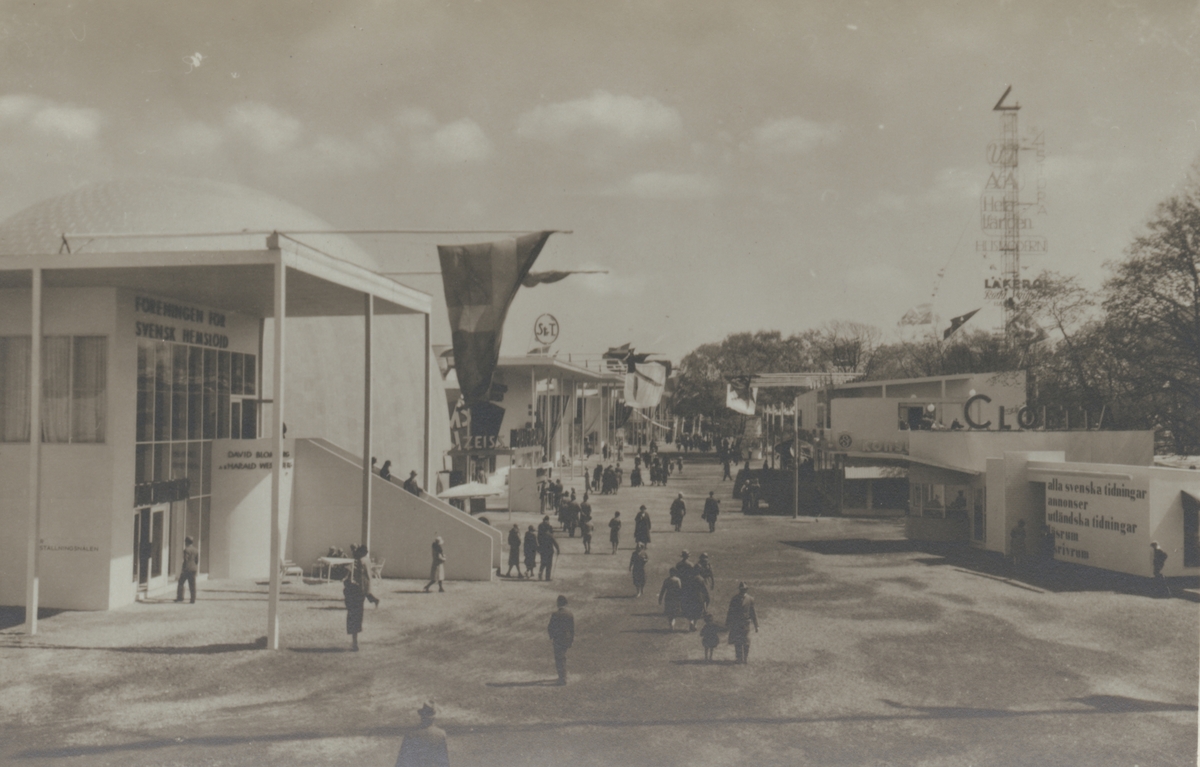 Fotografi från Stockholmsutställningen 1930. Motiv av utställningsområde med reklam för olika företag såsom Cloetta och Läkerol.