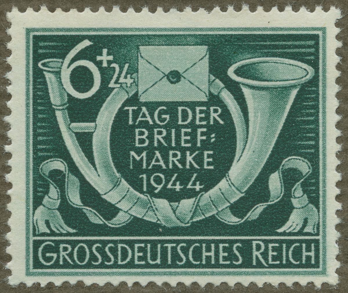Frimärke från Tyskland, 1944. Motiv av Posthorn med brevkuvert "Frimärkets Dag"