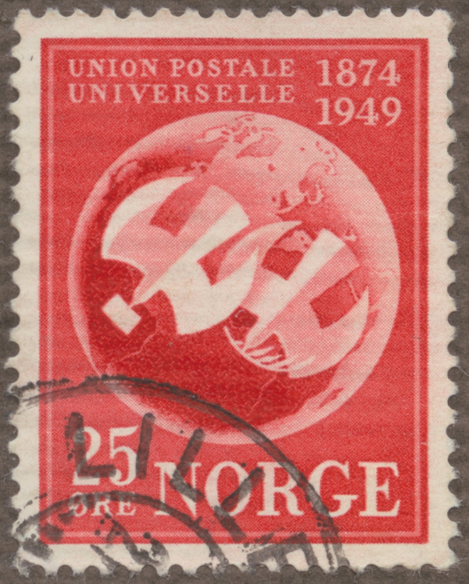 Frimärke från Norge, 1949. Motiv av Brevduvor Postsymbol 75-årsminne av Världspostföreningen 1874-1949.