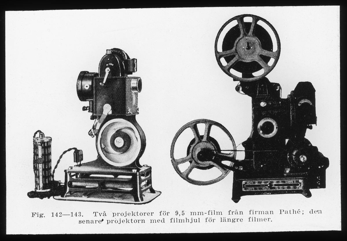 Skioptikonbild från institutionen för fotografi vid Kungliga Tekniska Högskolan. Använd av professor Helmer Bäckström som undervisningsmaterial. Bäckström var Sveriges förste professor i fotografi vid Kungliga Tekniska Högskolan 1948-1958. talet. Två projektorer från firman Pathé , den senare projektorn med filmhjul för längre filmer. För med info: Se Fotografisk Handbok av Helmer Bäckström. Natur och Kultur. Andra omarbetade upplagan1958-59 sid 1266.