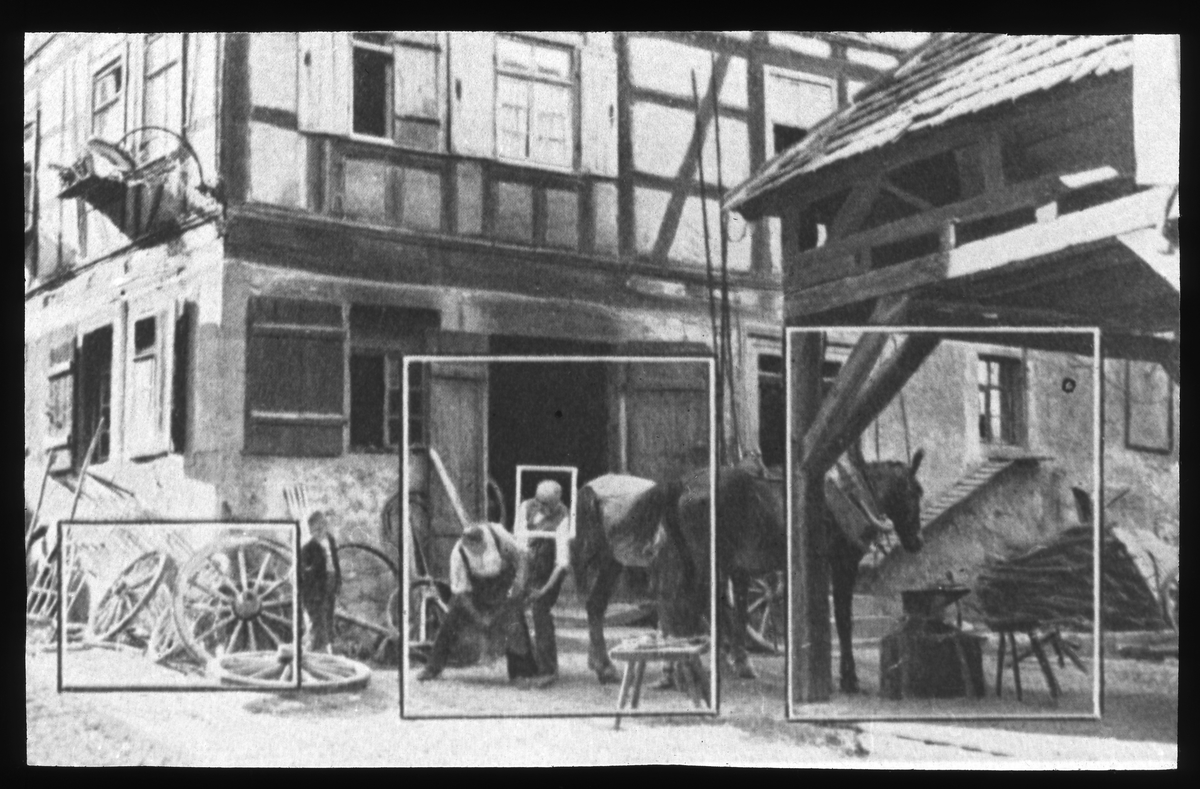 Skioptikonbild från institutionen för fotografi vid Kungliga Tekniska Högskolan. Använd av professor Helmer Bäckström som undervisningsmaterial. Bäckström var Sveriges förste professor i fotografi vid Kungliga Tekniska Högskolan 1948-1958. Hovslageri. Bilden visar beskärningsteknik. Se Fotografisk Handbok av Helmer Bäckström. Natur och Kultur. Andra omarbetade upplagan 1958-59. Kap. 123. Bildproportioner och bildbeskärning. (Bilden är en reproduktion.)