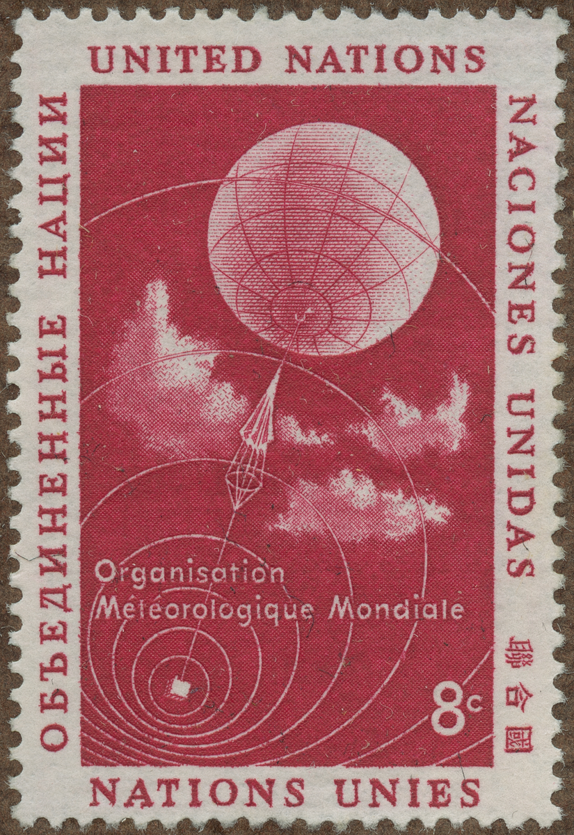 Frimärke från Förenta Nationerna, 1957. Motiv av Moln och Vädersond med ballong. Symbol för: World Meteorological Organisation