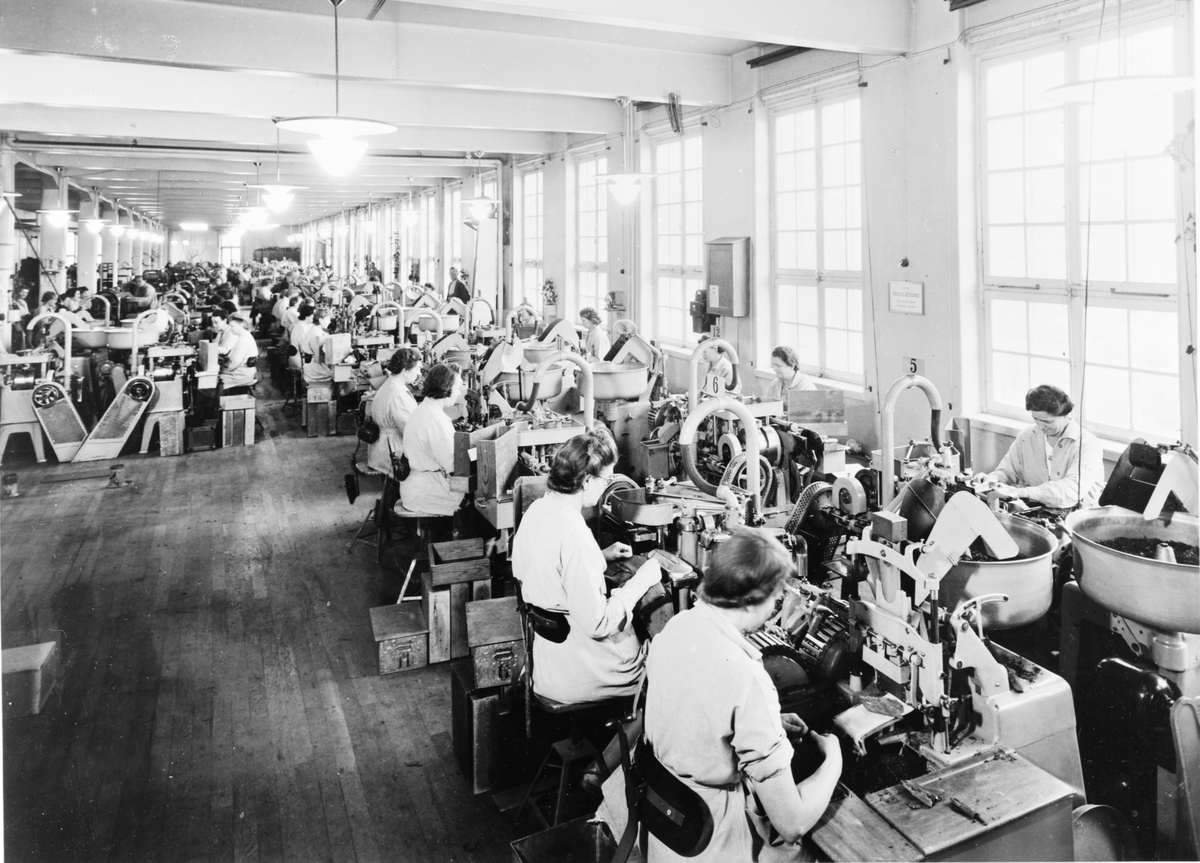 Tobaksfabriken i Stockholm. Tillverkning av cigarrcigaretter i s.k. vickel- och överrullningsmaskiner.