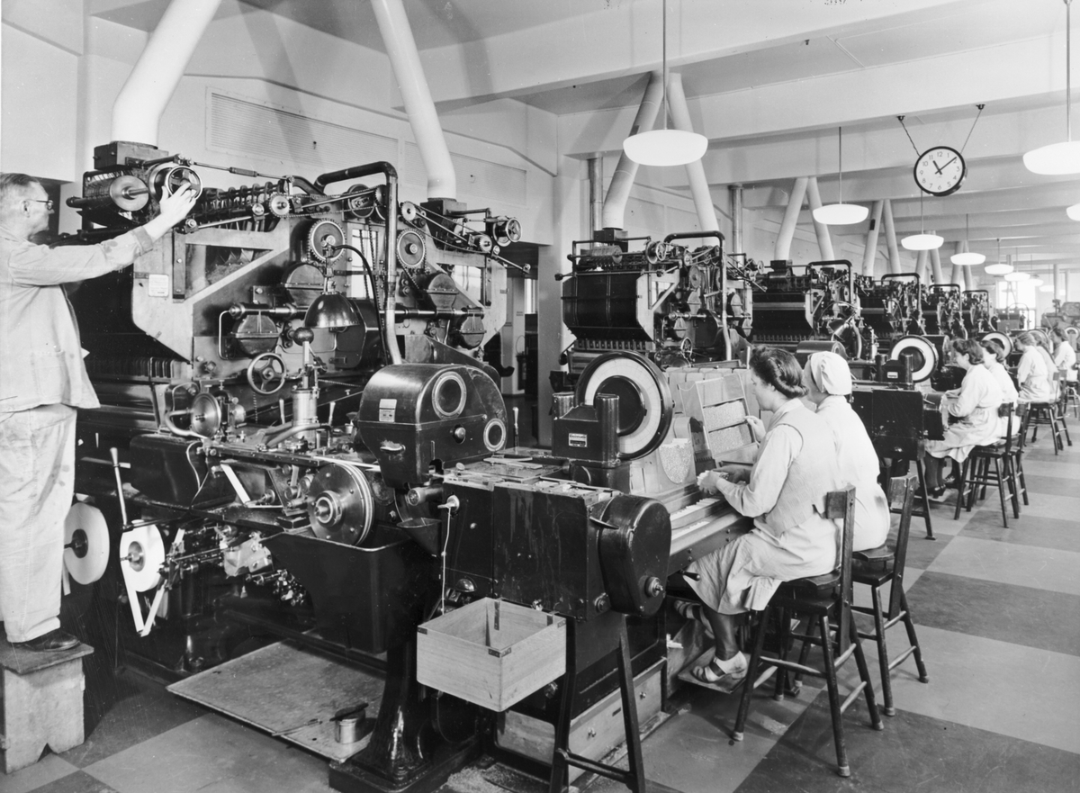 Tobaksfabriken i Stockholm. Maskin för tillverkning av s.k. sträng-cigaretter /cigaretter utan munstycke/. /Kapacitet per dag och maskin: 500.000 st. /20 cigaretter per sekund/.2 sådana maskiner betjänas av 7 personer.