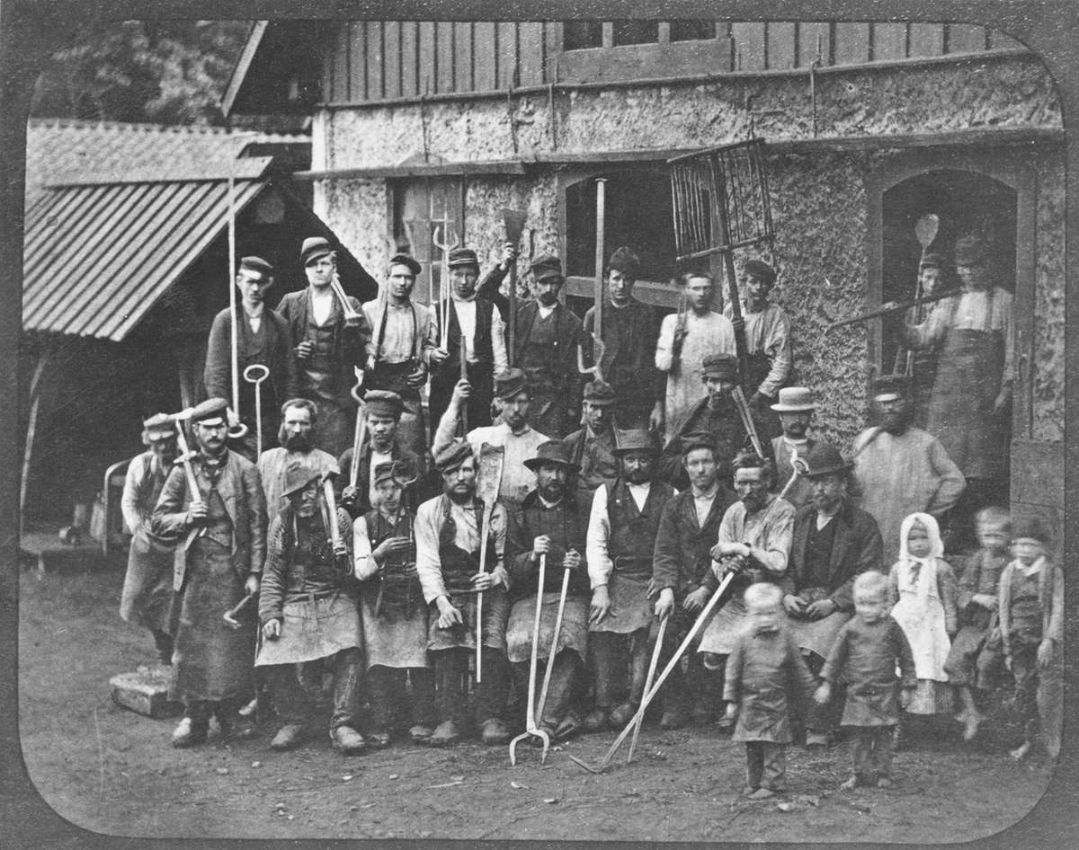 Smeder vid Hagge Bruk år 1880. Bilden visar smidesmästare, smältare, hjälpbrytare, smältardrängar, klensmed och spiksmed.