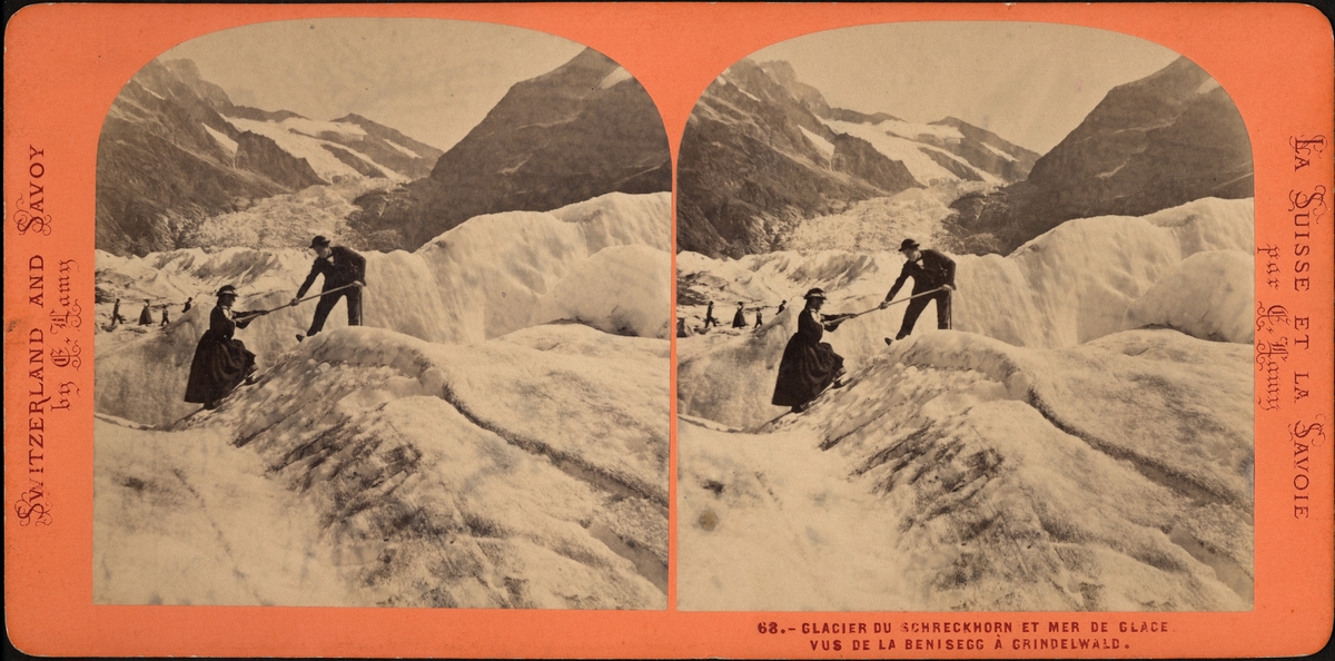 Stereobild av man som hjälper kvinna upp vid glaciären Schreckhorn och Grindelwaldglaciären.