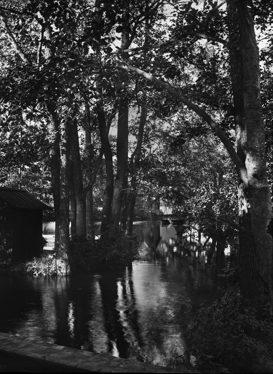 Diapositiv, fönsterbild av sjö/å, möjligen i Hedemoratrakten.
