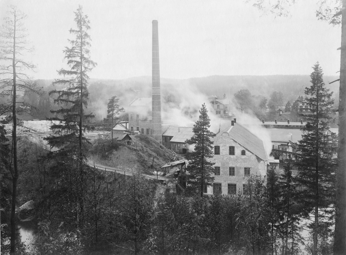 Koppoms pappersbruk sett från öster. Upptill bakom granen synes i bakgrunden Koppoms herrgård. Bostadshuset längst till höger en arbetarbostad.