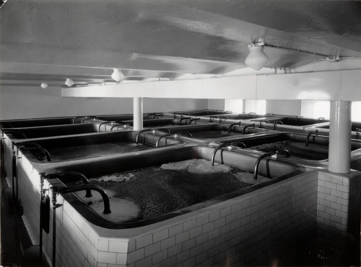 Nyköping Bryggeri Aktiebolag. Interiör av jäskällaren. Glasemaljerade ståljäskar med vardera 80 hl. rymd.