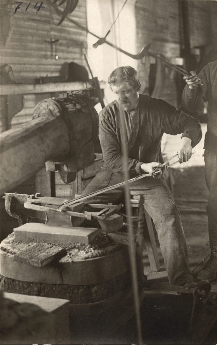 AB Hammerdals Liefabrik, interiör. Arbete vid skafthammaren. Mannen på bilden är Wilhelm Källström, Edefors.