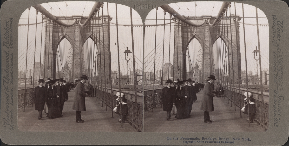 Stereobild, promenad på Brooklyn Bridge, New York.