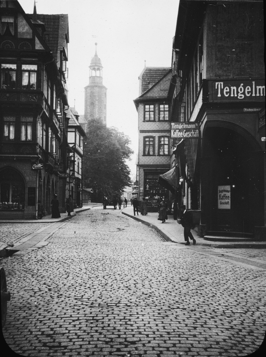 Skioptikonbild med motiv från gata i Goslar med Marktkirche St. Cosmas i bakgrunden.