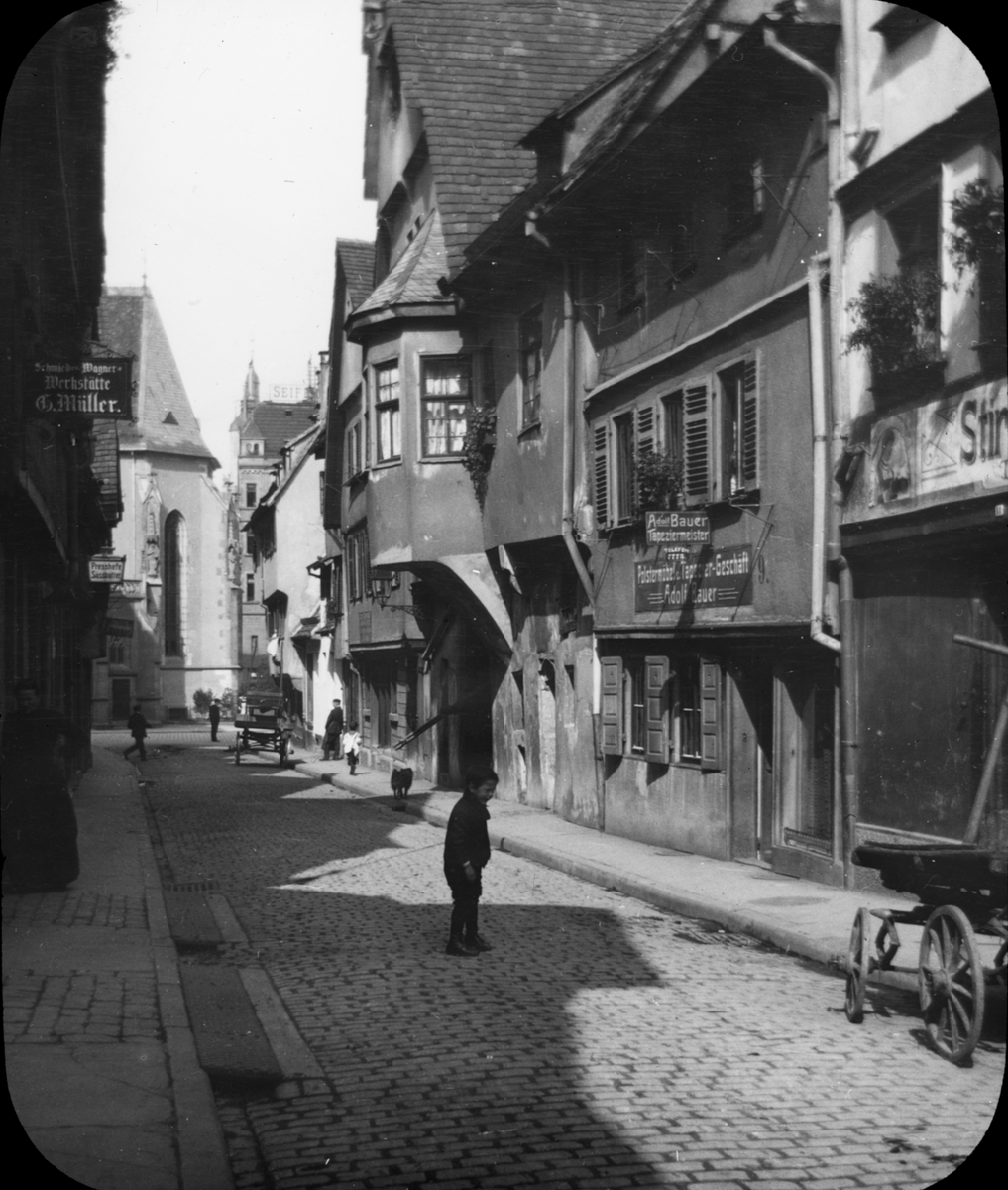 Skioptikonbild med motiv från gränd i Stuttgart.