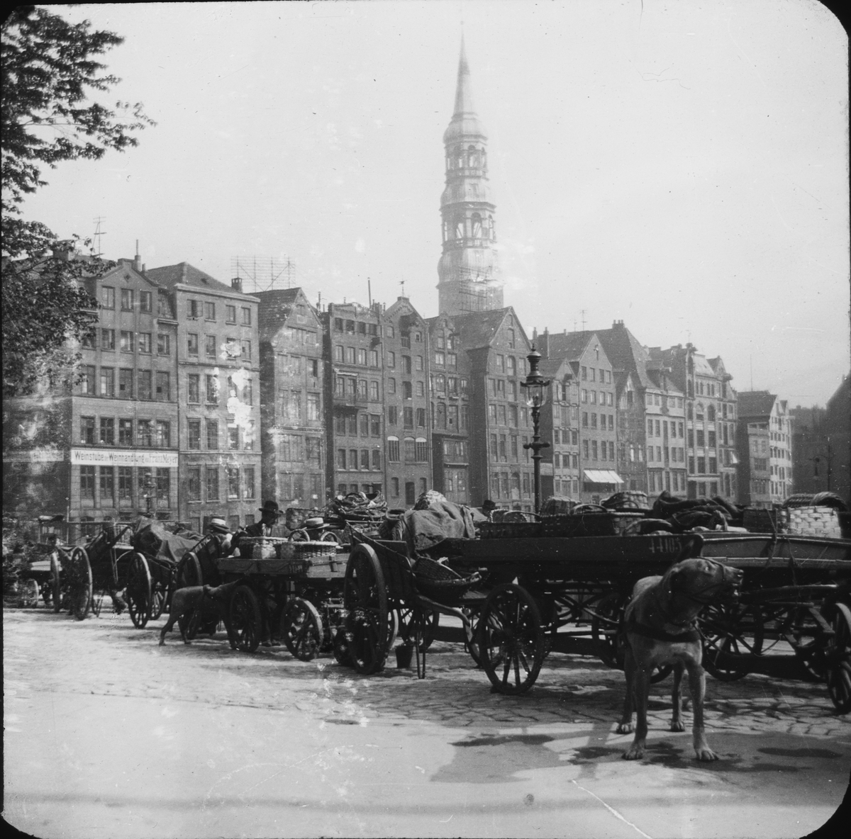Skioptikonbild med motiv av vagnparkering i okänd stad.