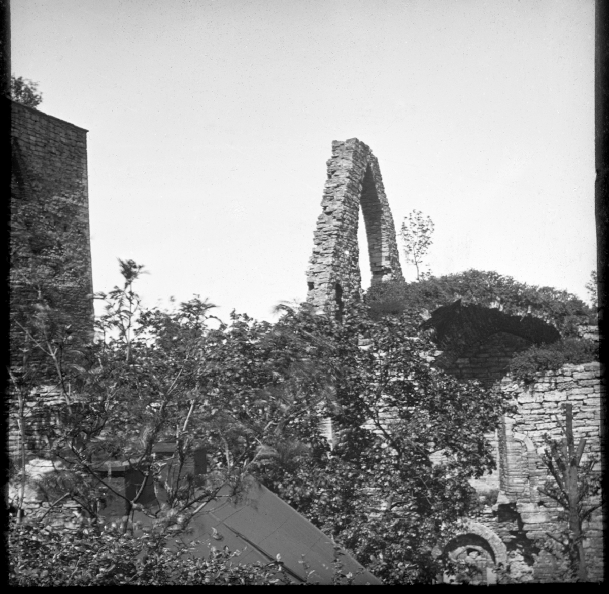 Skioptikonbild från institutionen för fotografi vid Kungliga Tekniska Högskolan. Motiv föreställande munkar en ruined växtlighet. Bilden är troligen tagen av John Hertzberg under en resa i Europa.