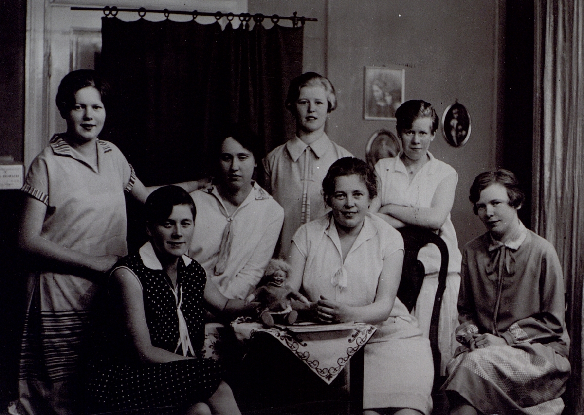Ljungbys telefonister. Gruppbild från 1920-talet. Bakre raden stående: Lisa Karlsson, Inez Johansson, Veda Svensson och Evy Gunnarsson. Sittande: Kerstin Hedkvist, Gerda Bengtsson och Magda Tomsen.