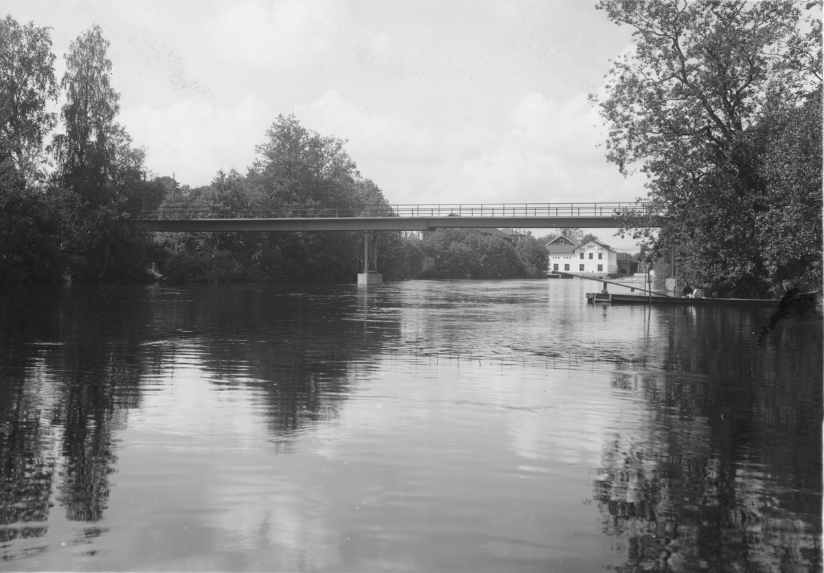 Morgårdshammars Mekaniska verkstad. Verkstadsområdena på ömse sidor om Bergslagsägsälven (Kolbäcksbron) förenas av bron som uppfördes 1937. Bron har en bärförmåga på 6 ton. I bakgrunden syns Morgårdshammars kraftstation, som förser verkstaden och den omkringliggande trakten med elektrisk energi, 1943.