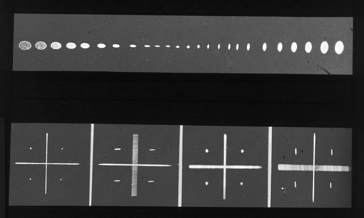 (övre bilden) Astigmatism, fotografiskt avbildad. Om plåten eller filmen placeras på olika avstånd från det astigmatiska objektivet, erhålles i stället för bildpunkter ljusfläckar av detta utseende. (nedre bilden) Avbildningar av ett kors vid användning av ett astigmatiskt objektiv.