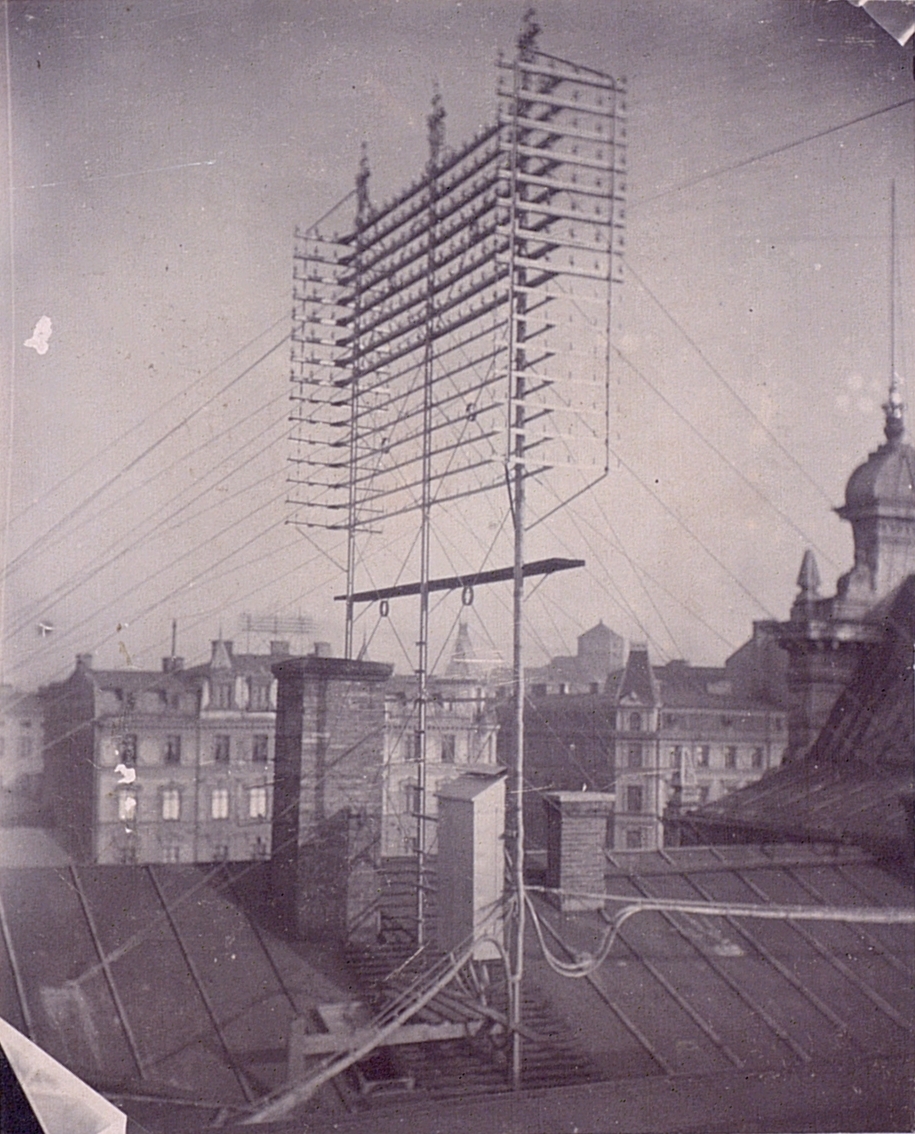 Telefonnät, troligen i Malmö år 1890. Telefongalge monterad på tak.