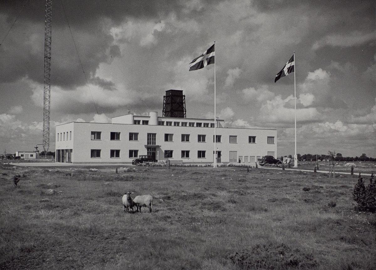 Hörby nya rundradiostation med antennhus, mast och kyltorn i bakgrunden. 1937 .