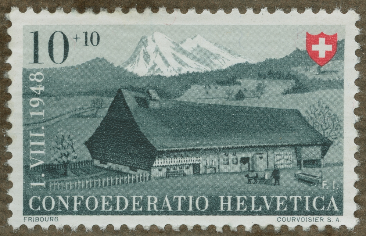 Frimärke från Schweiz, 1948. Motiv av typisk gård i Fribourg.
