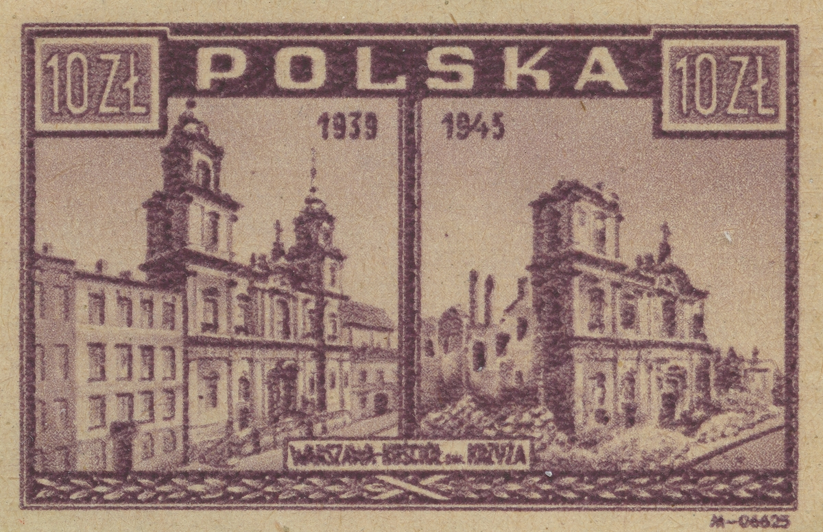 Frimärke från Polen, 1945. Motiv av före (1939) och efter (1945) bombning av Warschau Katedralen Heliga Korset. "Världskrig II".
